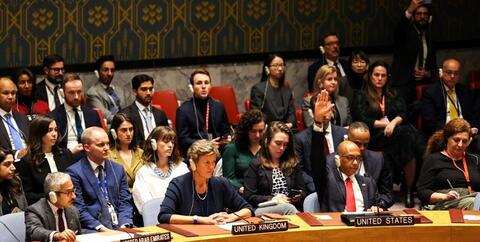 شورای امنیت سازمان ملل، شامگاه جمعه، برای بررسی قطعنامه پیشنهادی امارات بهمنظور برقراری آتشبس در نوار غزه تشکیل جلسه داد. ۱۳ عضو شورای امنیت به پیشنویس این قطعنامه رأی مثبت دادند اما با وتوی آمریکا و رای ممتنع انگلستان، سازمان ملل برای توقف جنگ ناکام ماند تا تصویر نمادین جلسه شورای امنیت سازمان ملل یعنی بالا آوردن دست نماینده ایالات متحده به عنوان تنها دستی که برای ادامه جنگ بالا رفت در تاریخ ثبت شود.