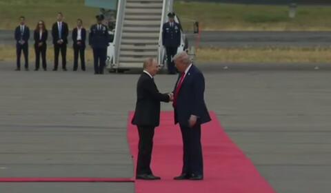 پس از فرود هواپیمای حامل پوتین، ترامپ از هواپیمای خود پیاده شد و به استقبال همتای روس خود رفت.