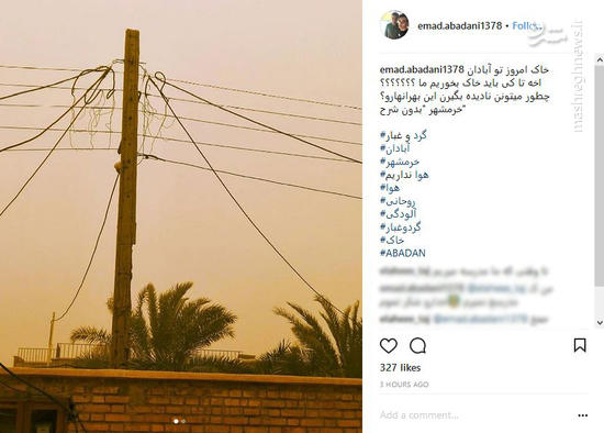 کد خبر 832509 تاریخ انتشار: ۲۹ بهمن ۱۳۹۶ - ۱۵:۴۵ عکس و فیلم عکس/ اینستاگرام غرق در گردوخاک واکنش کاربران فضای مجازی ساکن خرمشهر نسبت به بی توجهی مسئولین به هجوم ریزگردها و هوای غبار آلود این شهر. اخبار مرتبط فیلم/ گردوغبار شدید در حوالی خرمشهر ریزگردها برای اهوازیها قابل تحملتر از حرفهای وزیر عکس/ وضعیت خطرناک در آبادان عکس/ هجوم ریزگردها به یزد عکس/ از این هوا لذت ببرید هوای تهران بازهم «ناسالم» شد برچسبها اینستاگرام گرد و خاک گرد و غبار آلودگی هوا محیط زیست فضای مجازی