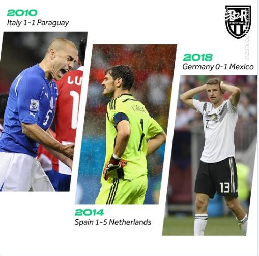 فرانسه به عنوان قهرمان جام جهانی 1998، در جام جهانی 2002 کره و ژاپن در مرحله گروهی بدون گل زده حذف شد، ایتالیا به عنوان قهرمان جام جهانی 2006، در سال 2010 در مرحله گروهی حذف شد و اسپانیا هم به عنوان قهرمان جام جهانی 2010 آفریقای جنوبی، در جام جهانی 2014 حذف شد.