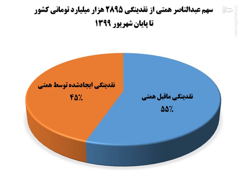 در پایان تیرماه سال ۱۳۹۷ حجم نقدینگی در کشور ۱۶۰۲ هزار میلیارد تومان بود که در پایان شهریور امسال به ۲۸۹۵هزار میلیارد تومان افزایش یافته است. همتی از اوایل مردادماه سال ۱۳۹۷ به ریاست بانک مرکزی منصوب شد.