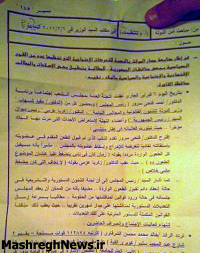 به گزارش گروه بينالملل مشرق، یک سند بسیار مهم که بهتازگي منتشر شده نشان میدهد عمرو موسی، نامزد لیبرال ریاستجمهوری انتخابات مصر در آستانه انقلاب مردمی در این کشور، به دنبال جلوگیری از این انقلاب بوده است.این سند در روز ششم فوریه تهیه شده و در آن، سران رژیم سابق از جمله "فتحی سرور" رئیس سابق پارلمان و "مفید شهاب" وزیر سابق و "زکریا عزمی" رئیس دفتر ریاست جمهوری از عمرو موسی خواستهاند تا کمیته حکمیت از افراد برجسته کشوری را تشکیل داده و به میدان التحریر برود و در آنجا از انقلابیون بخواهد که تظاهرات را رها کنند.