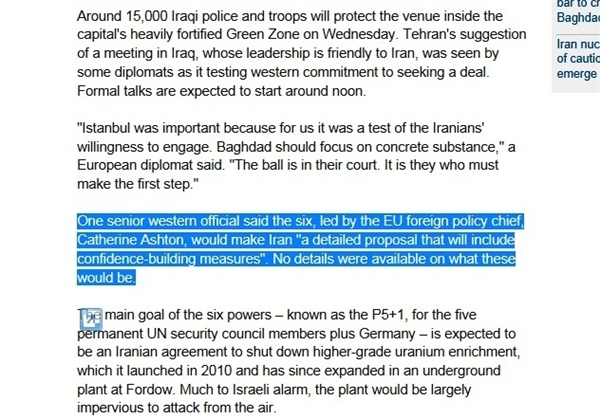 یک مقام غربی که نامی از وی برده نشده است میگوید که شش کشور، تحت مدیریت کاترین اشتون، مسوول سیاسی خارجی اتحادیه اروپا، قصد دارند "یک پیشنهاد تفصیلی" (Detailed Proposal) به ایران ارائه کنند که شامل برخی اقدامات اعتمادساز است. وی جزئیات بیشتری از این پیشنهاد را فاش نکرد.