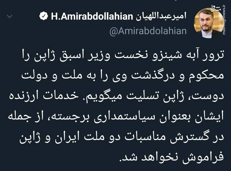 به گزارش مشرق، حسین امیرعبداللهیان وزیر امور خارجه کشورمان با انتشار مطلبی در حساب کاربری خود در توئیتر نوشت: ترور آبه شینزو نخست وزیر اسبق ژاپن را محکوم و درگذشت وی را به ملت و دولت دوست، ژاپن تسلیت میگویم.