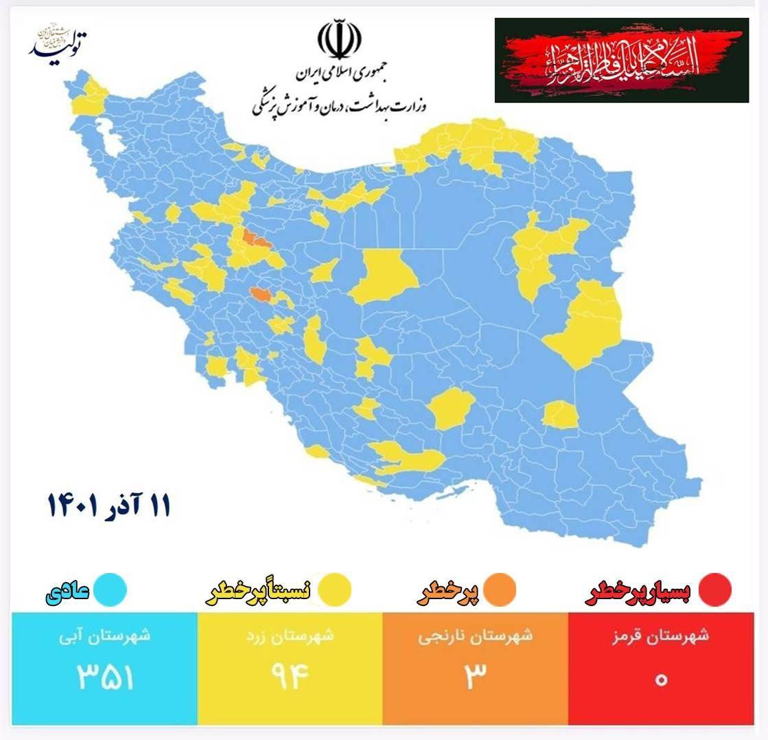 همچنین تعداد شهرهای با وضعیت زرد از ۱۱۴ به ۹۴ شهر کاهش و تعداد شهرهای با وضعیت آبی از ۳۳۱ به ۳۵۱ شهر افزایش یافت.
