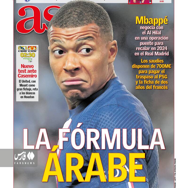 نشریه «آس» اسپانیا امروز تیتر یک خود را به موضوع انتقال امباپه با عربستان گذاشت و اعلام کرد ستاره فرانسوی برای مذاکره با سعودی ها چراغ سبز نشان داده تا یک سال در لیگ عربستان بازی کند و سال ۲۰۲۴ به رئال بیاید.