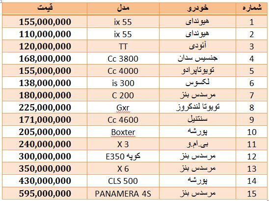 برخی موارد مثل بی ام و x6 حداقل ۱۵۰ میلیون تومان با بازار واقعی فرق داره ! بقیه هم همینطور ! یا اعداد بسیار قدیمی هست یا واقعیت بازار نیست ! اگر هست من با این قیمت چند تا می خوام ! :دی