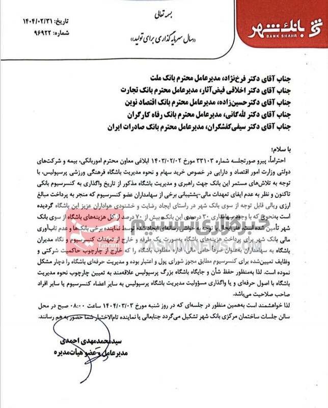 پیرو صورتجلسه شماره ۳۳۱۰۳ مورخ ۱۴۰۳/۰۲/۰۲ ابلاغی معاون محترم اموربانکی، بیمه و شرکتهای دولتی وزارت امور اقتصاد و دارایی در خصوص خرید سهام و نحوه مدیریت باشگاه فرهنگی ورزشی پرسپولیس با توجه به تلاشهای مستمر این بانک جهت راهبری و مدیریت باشگاه مذکور از تاریخ واگذاری به کنسرسیوم بانکی تاکنون و نظر به عدم ایفای تعهدات مالی پشتیبانی برخی از سهامداران عضو کنسرسیوم که منجر به پرداخت مبالغ ارزی ریالی قابل توجه از سوی بانک شهر در راستای ایجاد رضایت و خشنودی هواداران عزیز این باشگاه گردیده است به نحوی که با وجود سهامداری ۳۰ درصدی این بانک بیش از ۷۰ درصد از کل هزینههای باشگاه از سوی بانک شهر تأمین شده است علی ایحال با توجه به حواشی رسانهای ایجاد شده توسط نماینده برخی بانکها و عدم تاب آوری مالی بانک شهر برای پرداخت هزینههای باشگاه به صورت یک طرفه و خارج از تعهدات کنسرسیوم و نگاه مدیران باشگاه به سهامداران به عنوان صرفاً حامی مالی، اداره مطلوب باشگاه را که خارج از چارچوب حاکمیت شرکتی و وظایف تعیین شده برای کنسرسیوم مطابق مجوز شورای پول و اعتبار بوده و مدیریت حرفهای باشگاه را دچار مشکل نموده است.