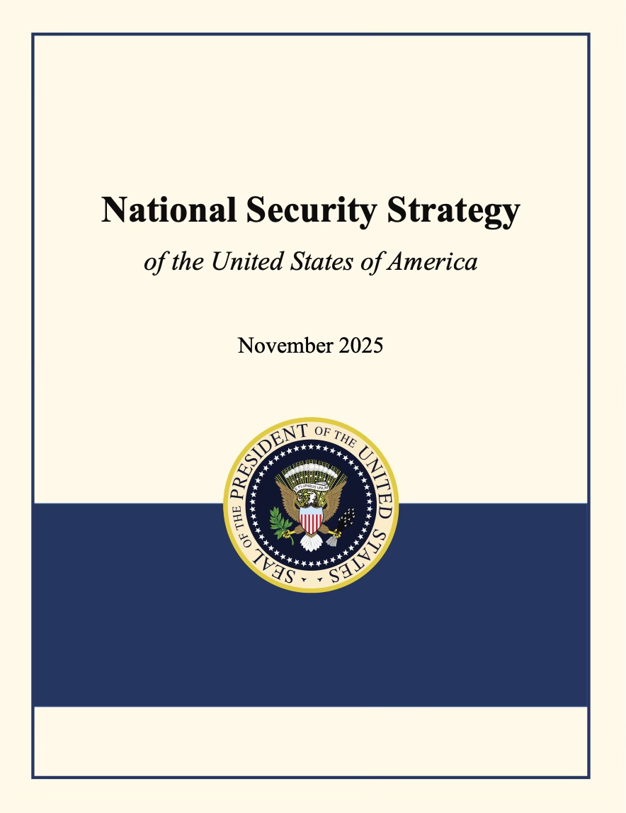 جلد سند راهبرد امنیت ملی سال ۲۰۲۵ دولت ترامپ. اگرچه انتشار سند راهبرد امنیت ملی چارچوب یا زمان‌بندی خاصی ندارد، اما معمولاً هر دولتی در آمریکا یک بار چنین سندی را منتشر می‌کند. متن کامل این سند را می‌توانید به زبان انگلیسی از این‌جا بخوانید. (+)