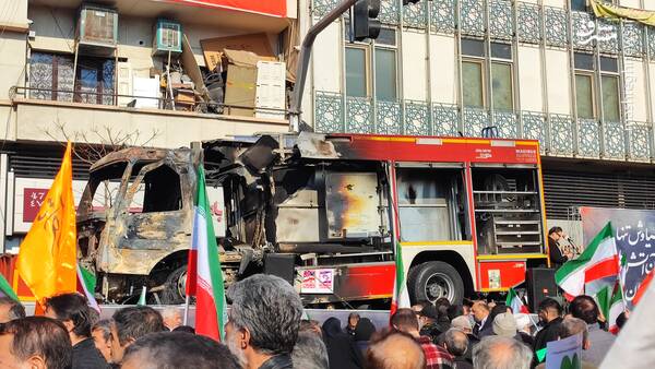 در این مراسم یکی از خودروهای آتش نشانی که توسط اغتشاشگران به آتش کشیده شده بود، در معرض دید عموم قرار گرفت.