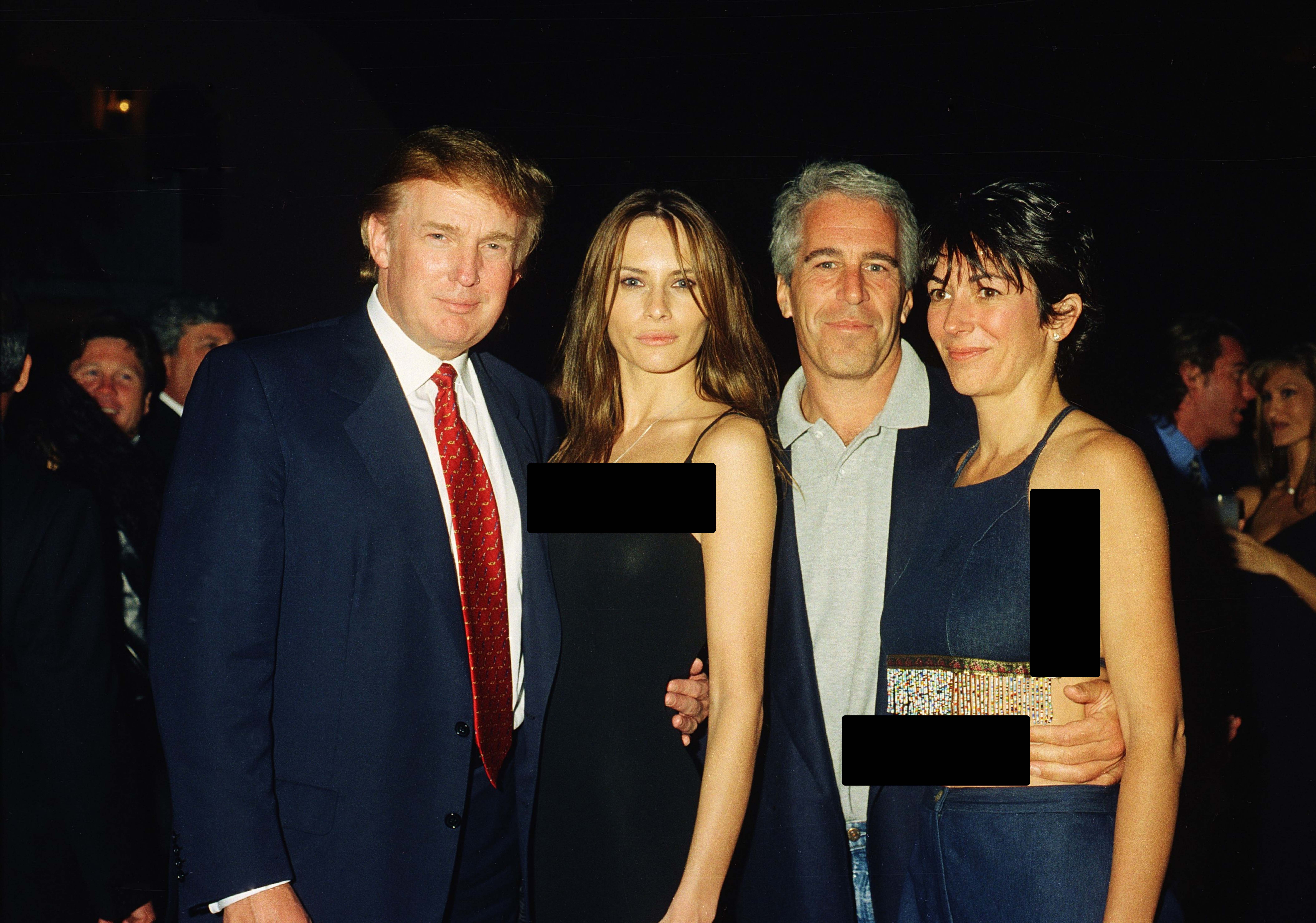 (از چپ) «دونالد ترامپ» رئیسجمهور کنونی آمریکا، «ملانیا کناوس» مدل و دوستدختر آن زمان و همسر کنونی ترامپ، «جفری اپستین» سرمایهدار و مجرم جنسی آمریکایی، و «گیلین مکسول» دوستدختر و همدست اپستین، ۱۲ فوریهی ۲۰۰۰، در عمارت مارئهلاگو متعلق به ترامپ در شهر پالمبیچ ایالت کالیفرنیا. اسناد نشان میدهند ترامپ و اپستین سالها با یکدیگر دوست بودهاند، اما به دلایلی این رابطه به هم خورده است. ترامپ ادعا میکند از جرائم جنسی اپستین بیخبر بوده و دخالتی در آنها نداشته. با این وجود، برخی اسناد منتشرشده ممکن است این ادعا را رد کنند (جزئیات بیشتر). (بخشهایی از این تصویر توسط مشرق سانسور شدهاند.) (+)