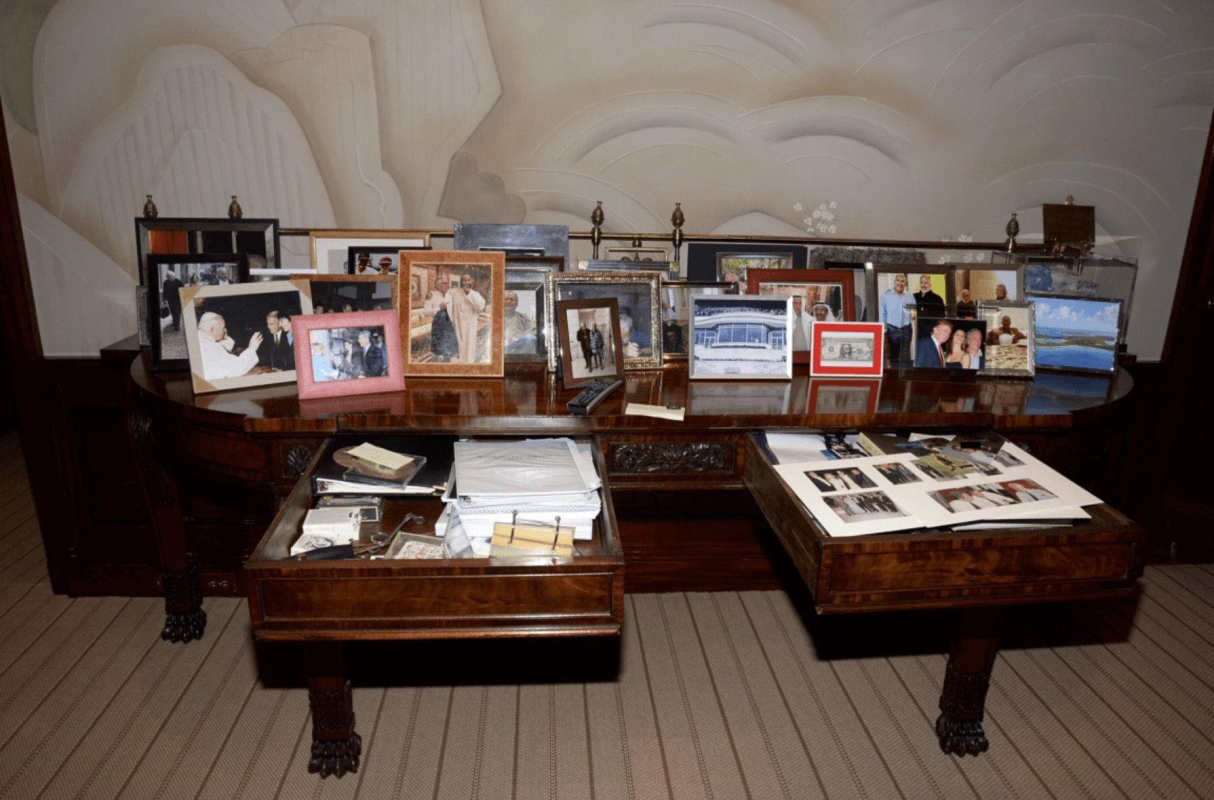این تصویر که توسط وزارت دادگستری آمریکا در قالب اسناد پروندهی «جفری اپستین» منشتر شده، شماری از عکسها و قابعکسهایی را نشان میدهد که ظاهراً اپستین روی میز و درون کشوهای میز خود در یکی از عمارتهایش نگه میداشته است. در این عکسها اپستین در کنار افراد سرشناسی مانند «دونالد ترامپ» رئیسجمهور کنونی آمریکا، و «محمد بنسلمان» ولیعهد سعودی، دیده میشود. وزارت دادگستری با انتشار اسناد جدید پروندهی «جفری اپستین» نهتنها عطش ناظران و افکار عمومی برای دانستن تمام حقایق این فساد گسترده را آرام نکرده، بلکه با پنهانکاری و ابهام به نام شفافیت، این عطش را شعلهورتر کرده. شماری از این اسناد به صورت کاملاً سانسورشده منتشر شدهاند که گواهی بر این گمانه است که چهبسا اطلاعات و اسناد زیادی اصلاً منتشر نشده باشند. (+)