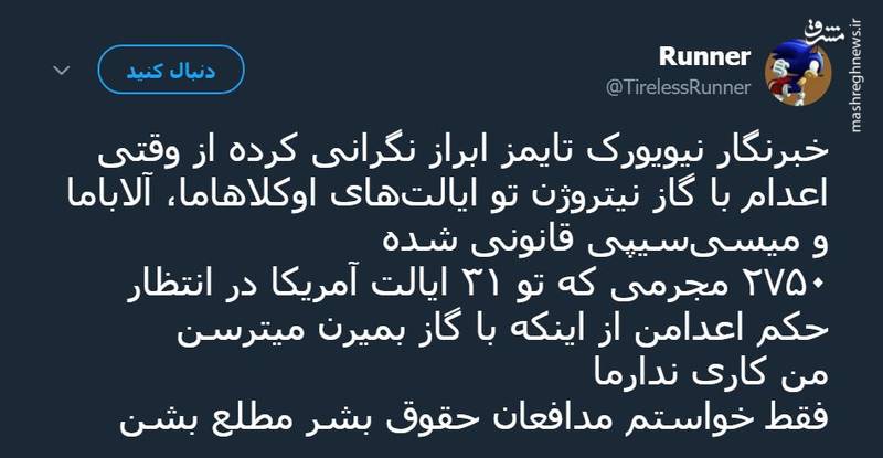 به گزارش مشرق، یک فعال فضای مجازی در توییتر خود درباره روش جدید اعدام در آمریکا و ابراز نگرانی کردن خبرنگار نیویورک تایمز، نوشت: