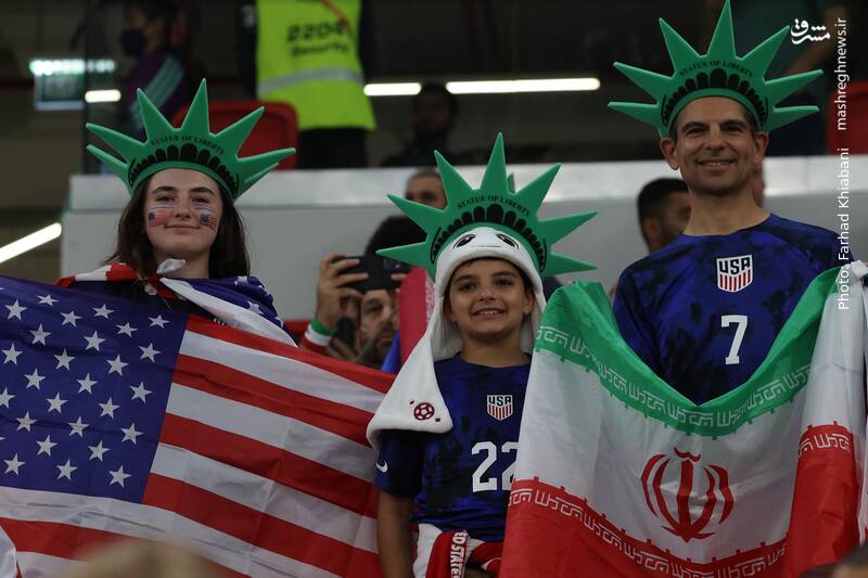 قابی عجیب از هوادار حاضر در استادیوم با پیراهن آمریکا و پرچم ایران را مشاهده میکنید.