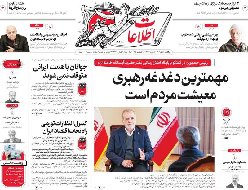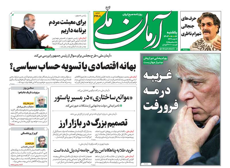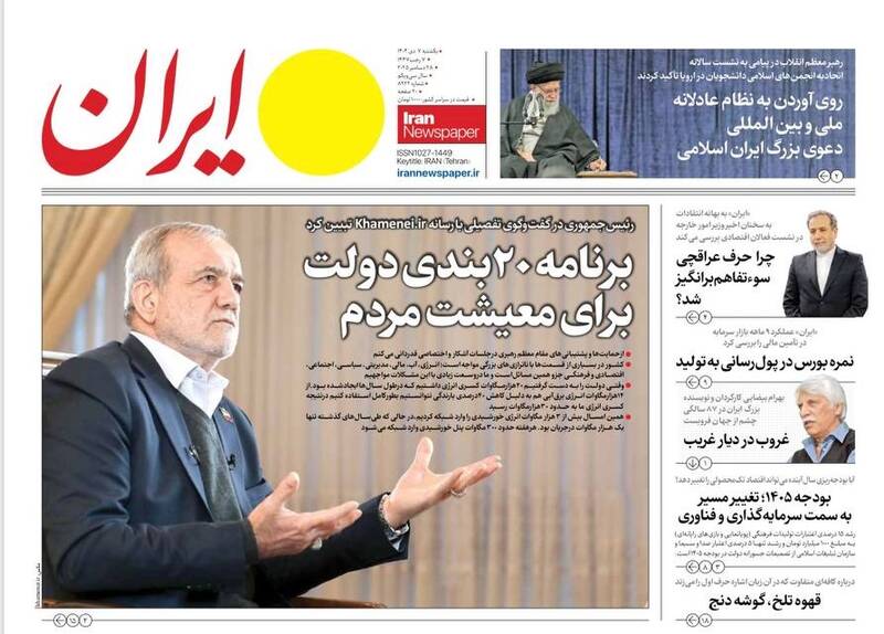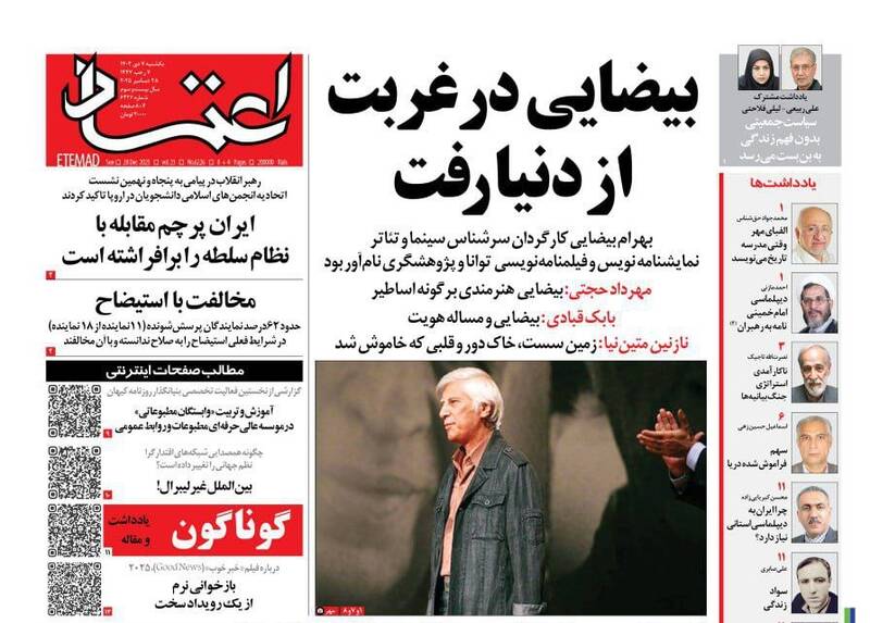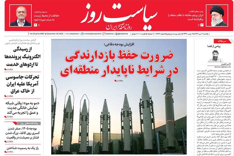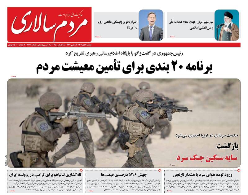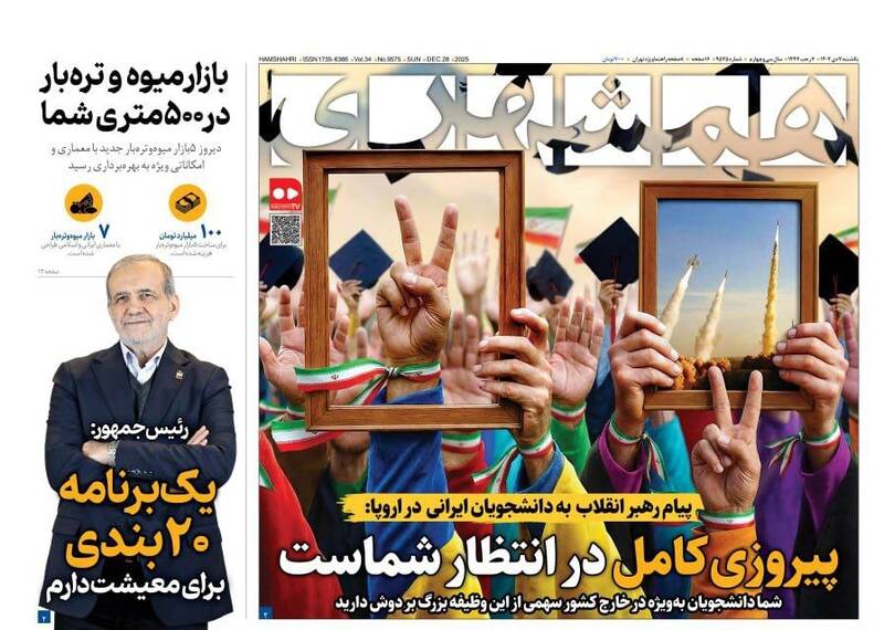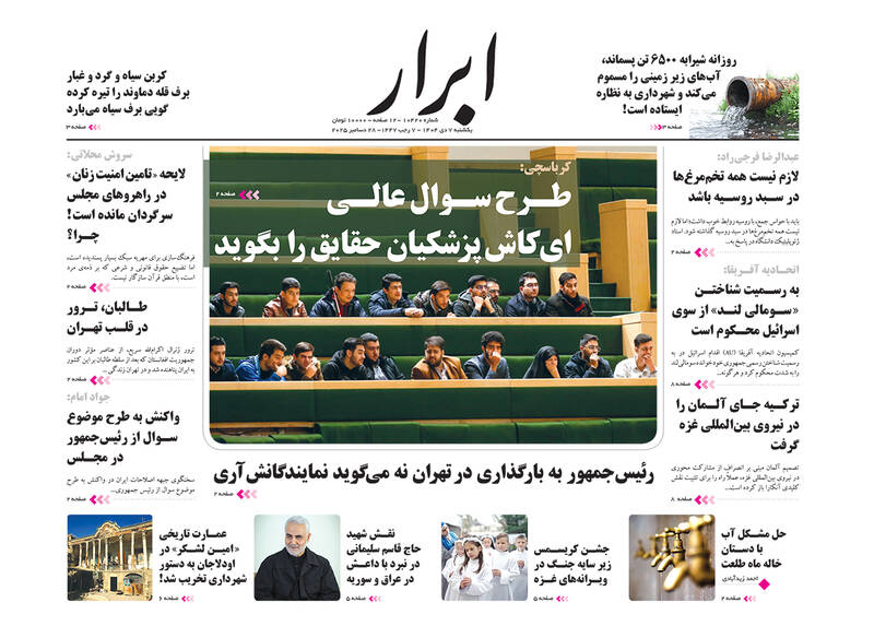 mshrgh.ir/1774724 کد خبر 1774724 تاریخ انتشار: ۷ دی ۱۴۰۴ - ۰۷:۵۴ ۴ نظر چاپ عکس و فیلم عکس/ صفحه نخست روزنامههای یکشنبه ۷ دی ۱۴۰۴ ایران پرچمدار تغییر نظم ناعادلانه جهان است، تهاجم آمریکا مغلوب جوانان ایران شد، بیضایی در غربت از دنیا رفت، ایران به دنبال نظم عادلانه ملی و...از جمله تیترهای روزنامههای یکشنبه ۷ دی هستند. اخبار مرتبط عکس/ صفحه نخست روزنامههای شنبه ۶ دی ۱۴۰۴ عکس/ صفحه نخست روزنامههای چهارشنبه ۳ دی ۱۴۰۴ عکس/ صفحه نخست روزنامههای سهشنبه ۲ دی ۱۴۰۴ عکس/ صفحه نخست روزنامههای دوشنبه ۱ دی ۱۴۰۴ عکس/ صفحه نخست روزنامههای یکشنبه ۳۰ آذر ۱۴۰۴ عکس/ صفحه نخست روزنامههای شنبه ۲۹ آذر ۱۴۰۴ برچسبها روزنامه های کشور صفحه نخست روزنامه ها ایران
