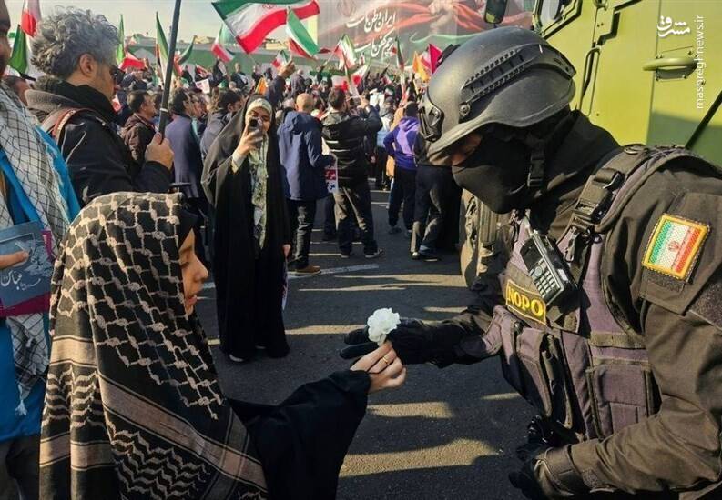 برخی شرکتکنندگان در اجتماع مردمیِ ضد اغتشاشات با اهدای گل از نیروهای حافظ امنیت تشکر کردند.