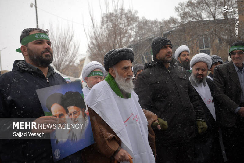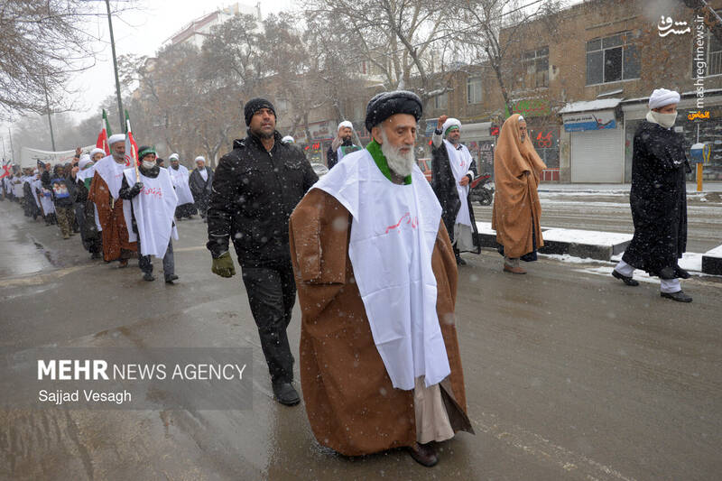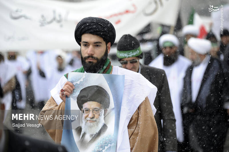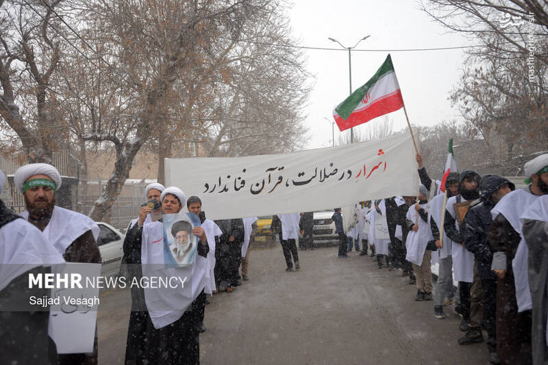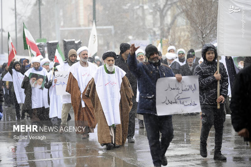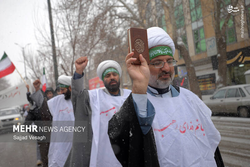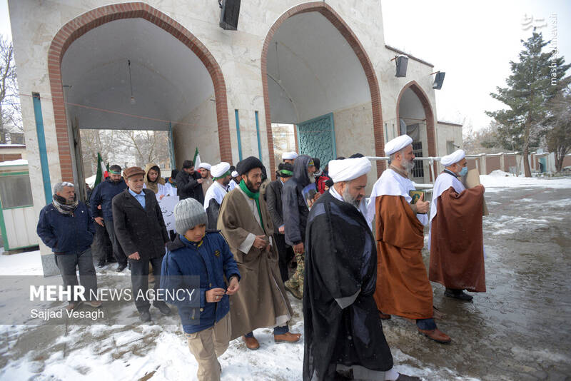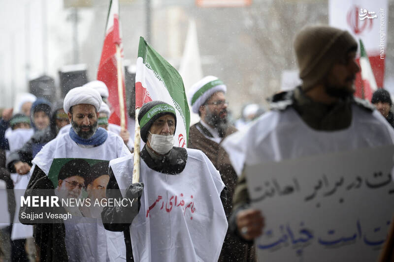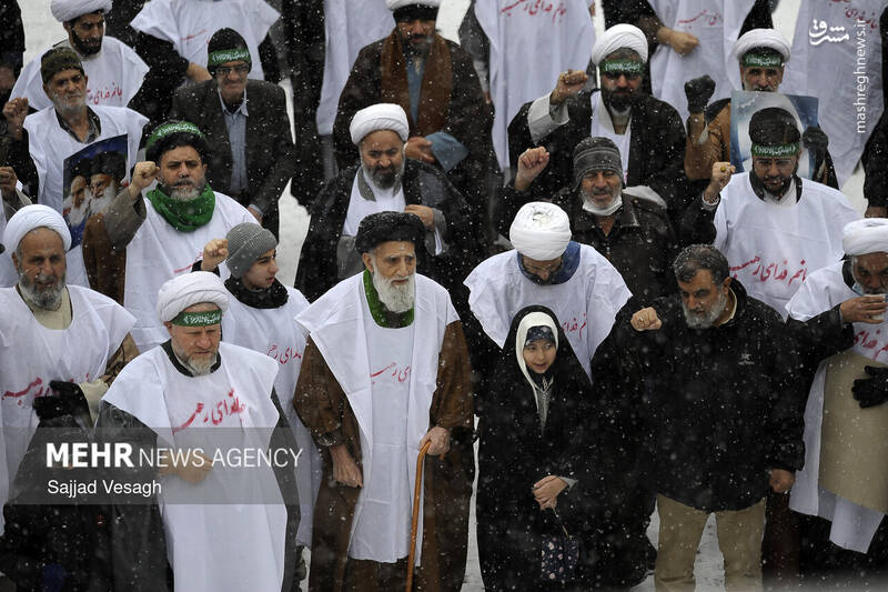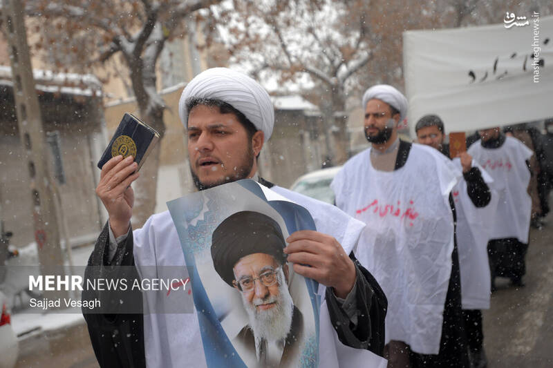 راهپیمایی اعتراضی طلاب و روحانیون همدان در هوای برفی