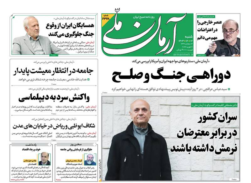 ضرورت اصلاح رویکردهای دولت برای تقویت ارزش پول ملی، ابعاد جنگ منطقهای، کتاب سوز مثل مغول، هم برای جنگ آمادهایم هم برای صلح و...از جمله تیترهای روزنامههای شنبه ۲ اسفند ۱۴۰۴ هستند.