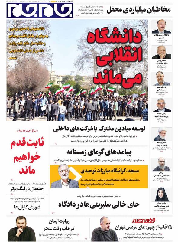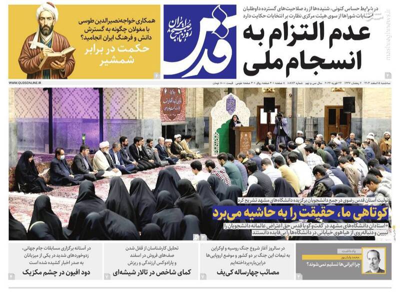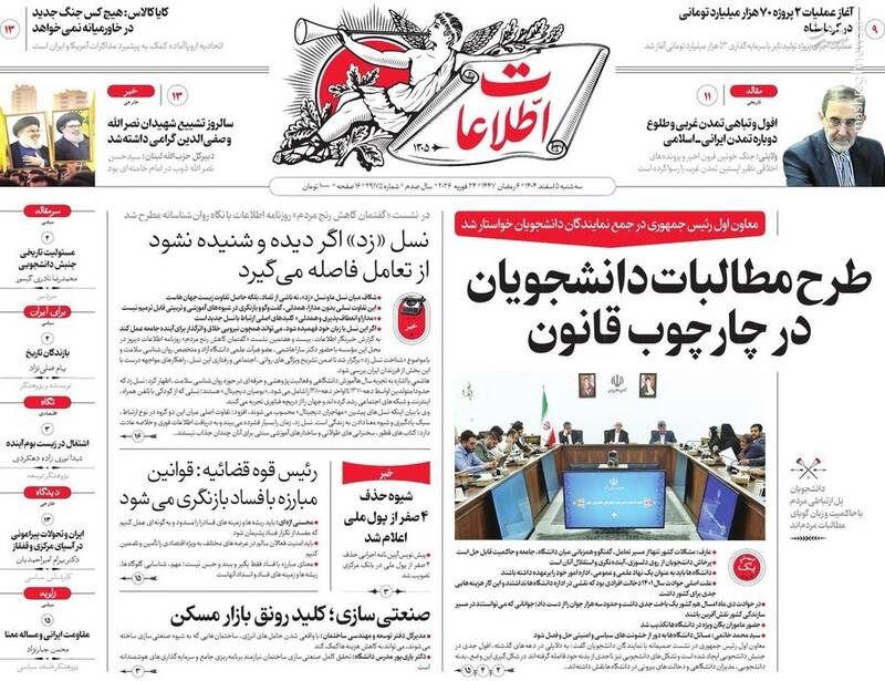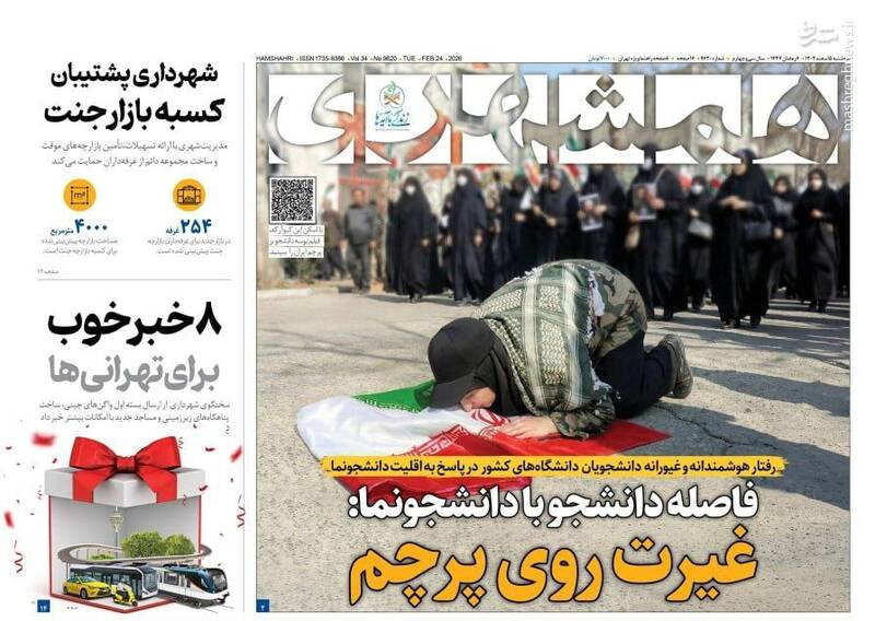 دانشگاه حرمت دارد جای یک مشت چاقوکش مزدور نیست، قرآن دوست داشتنی، پرچم دانشگاه بالاست، دُم تجزیه بیرون زد، غیرت روی پرچم و...از جمله تیترهای روزنامه‌های سه‌شنبه ۵ اسفند ۱۴۰۴ هستند.