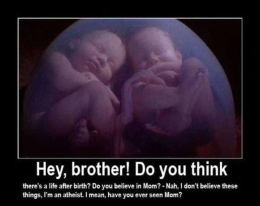 تو که هی دم میزنی اون دنیا و روز قیامتی وجود نداره اون بچه تو شکم هم مثل تو فکر میکرد الان که متلود شده به جواب سوالش رسیده یکی خوشحال یکی ناراحت