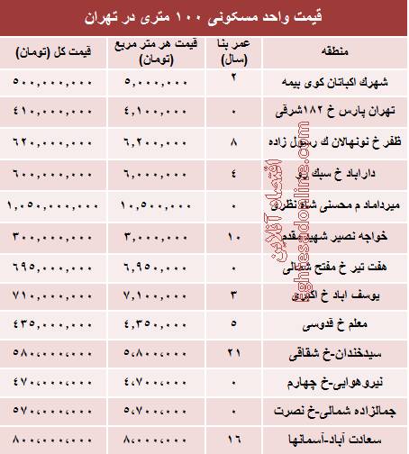 آنچه در زیر میآید جدول قیمت معاملات انجام شده آپارتمان 100 متری در مناطق 22گانه شهری تهران طی خرداد ماه 96 است. لازم به ذکر است که این ارقام مربوط به اعلام سامانه اطلاعات بازار املاک ایران می باشد: