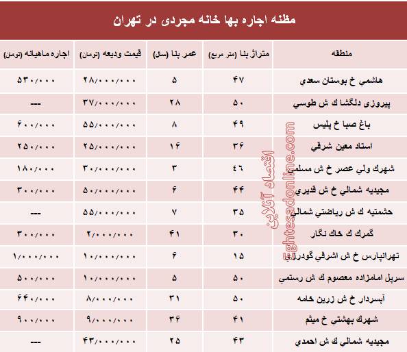 آنچه در زیر میآید قیمت معاملات انجام شده رهن و اجاره خانه با متراژ پایین در تهران طی دی ماه 96 است. لازم به ذکر است که این ارقام مربوط به اعلام سامانه رسمی املاک می باشد.