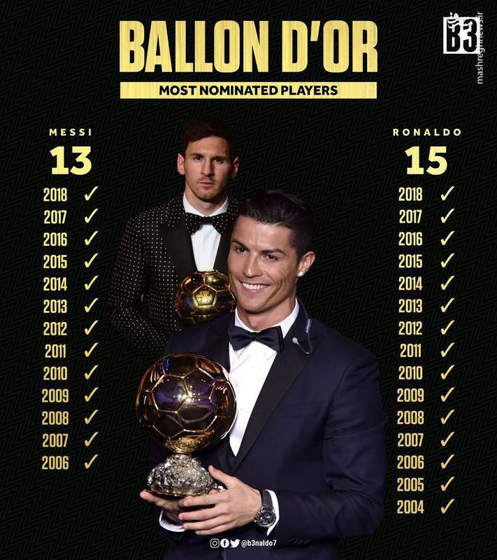 رکوردداران حضور در فهرست توپ طلای فرانس فوتبال، کریستیانو رونالدو بازیکن تیم یوونتوس با 15 حضور و لیونل مسی مهاجم بارسلونا نیز با 13 بار رکورددار هستند.